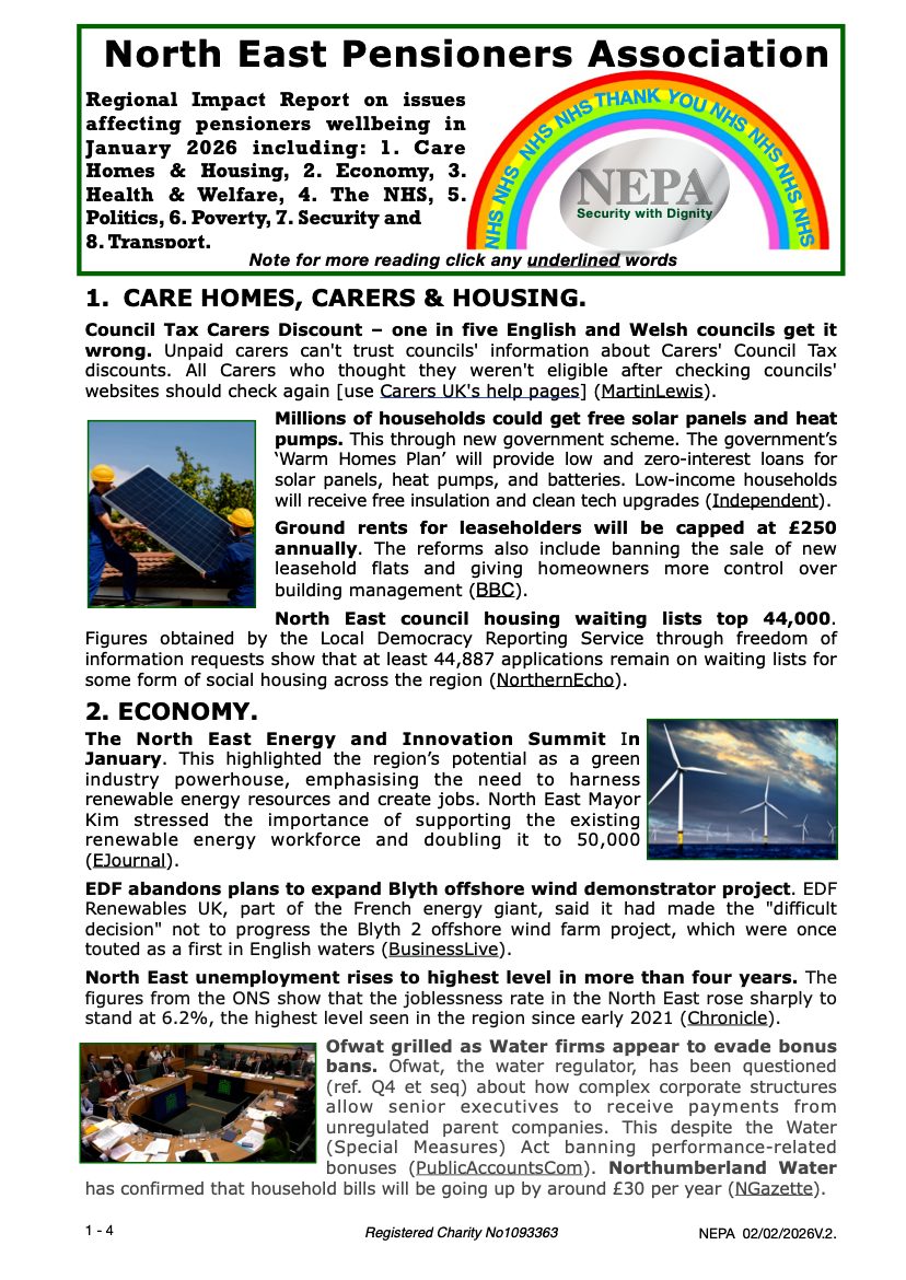 Our reports reflect each month on the positive and negative impacts on older people in the North East. These are covered under 8 general headings: Care Homes & Housing, Economy, Health & Welfare, NHS, Politics, Poverty, Security and Transport.